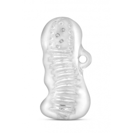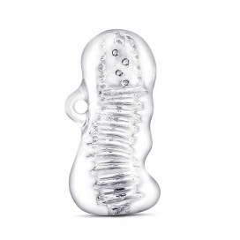 Transparent masturbator with rib-dot inner walls, housed inside a reality-clear transparent containe..