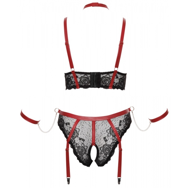 Krūšturis, zeķturu biksītes bez kājstarpes, apkakle un 2 roku aproces komplektā no Cottelli BONDAGE PLUS. Smalkās melnās, elastīgās mežģīnes ir sarežģīti dekorētas ar kontrastējošām detaļām sarkanā matētā izskatā un sudraba krāsas aksesuāriem. Krūšturis ar mīkstiem kausiņiem un regulējamu aizdari ar āķi aizmugurē. Arī krūštura lencītes ir regulējamas, lai tās atbilstu, tāpat kā zeķturu siksnas. Biksītes ir atvērtas kājstarpē. Biksīšu jostas sānos ir gredzens, kurā iekļautās roku aproces var viegli ieāķēt ar āķīšiem. Mīkstās aproces ir regulējamas ar āķa un cilpas stiprinājumiem.
