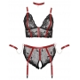 Melns mežģīņu apakšveļas komplekts ar sarkanām detaļām un atvērtu kājstarpi 3XL - Cottelli BONDAGE